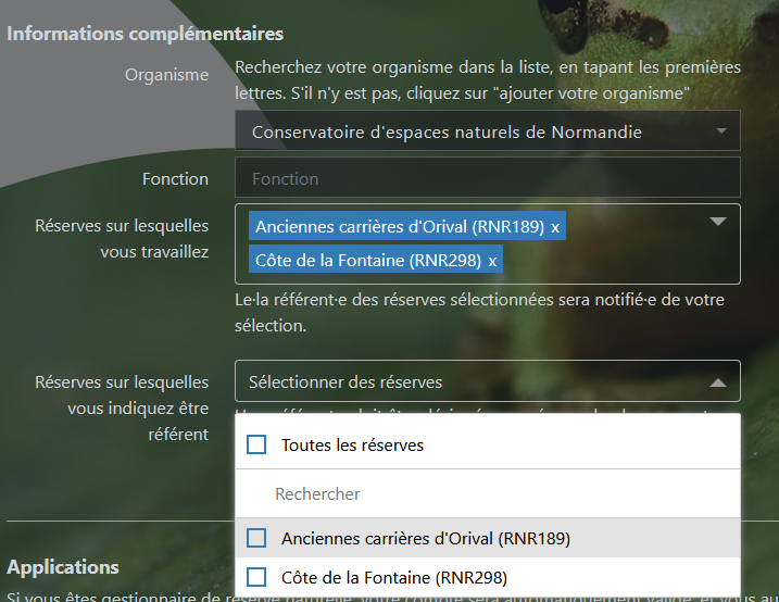 Dès lors qu’au moins une réserve est sélectionnée, une troisième liste déroulante apparait contenant uniquement les réserves sélectionnées. Cochez la ou les réserves pour lesquelles vous êtes le référent, c’est à dire typîquement des postes de conservateur·trice ou de directeur·trice de réserve. Il peut y avoir plusieurs référents pour une même réserve, selon vos choix.