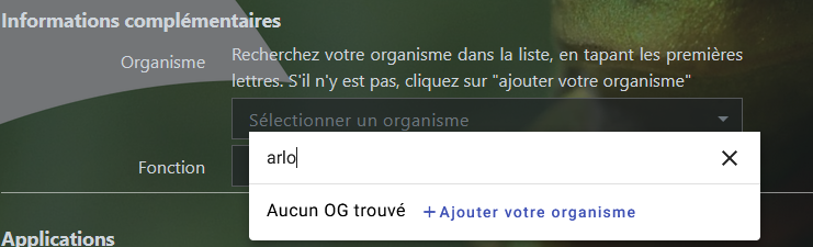 Si votre organisme n’est pas dans la liste, la mention « Aucun OG trouvé » s’affiche à la recherche, et vous pouvez cliquer sur « Ajouter votre organisme ».