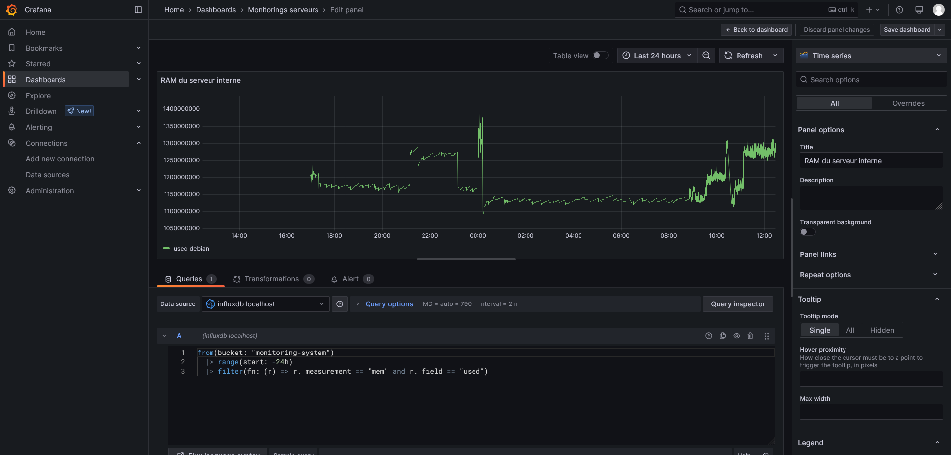 Voici une requête pour les données de RAM utilisée des dernières 24h :