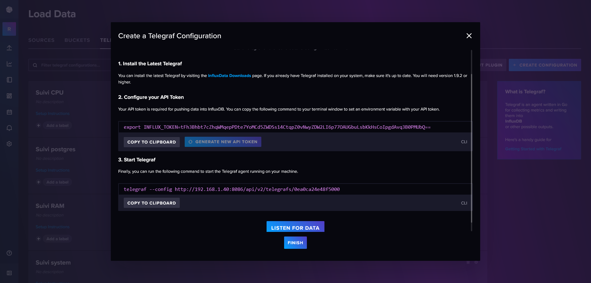 Vous devez enfin copier/coller les commandes proposées dans votre terminal pour enregistrer le token et lancer l’agent telegraf :