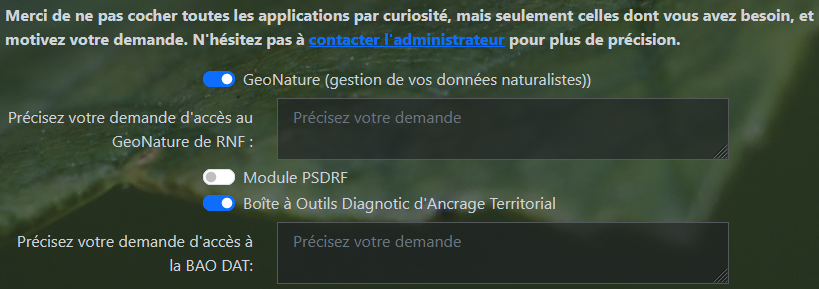 Certaines applications nécessitent simplement d’avoir un compte, comme l’annuaire des tourbières du réseau ou le nouveau site internet de RNF. D’autres vont nécessiter une validation d’accès (BAO Ancrage, GeoNature, PSDRF…). Précisez bien votre demande pour faciliter la modération.