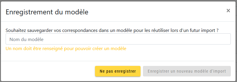 Si votre source de données est souvent la même, vous pouvez enregistrer votre modèle d’import pour gagner du temps. Cela vous est proposé en cliquant sur « Suivant ». Vous pouvez à l’inverse charger un modèle d’import, en tout début de formulaire, en le choisissant dans la liste déroulante.