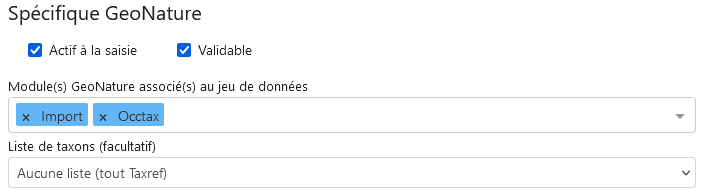 La liste des modules est très importante, sélectionnez bien les modules avec lesquels vous voulez utiliser le JDD sinon ça ne marchera pas. Sélectionnez « Import » pour pouvoir y importer des données depuis un csv, « Occtax » pour y faire de la saisie d’occurences de taxons…