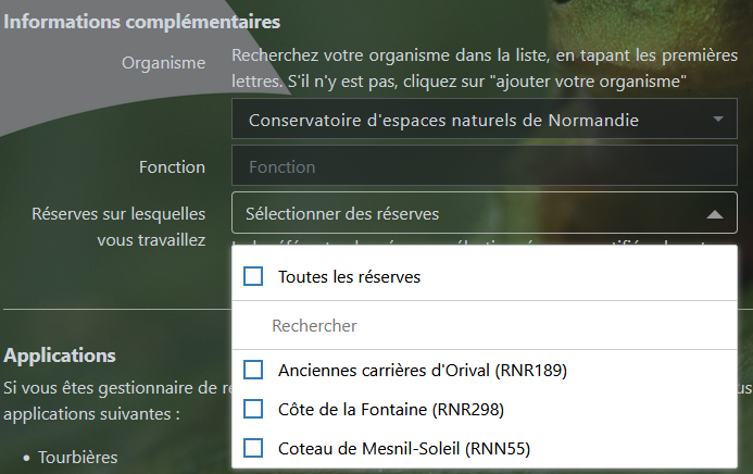 Si votre organisme était bien dans la liste et est gestionnaire de réserve, une nouvelle liste déroulante apparait avec l’ensemble des réserves dont l’OG est gestionnaire ou co-gestionnaire. Sélectionnez la ou les réserves qui vous concernent directement. Il est possible de n’en sélectionner aucune si vous travaillez pour un OG mais pas sur une réserve.