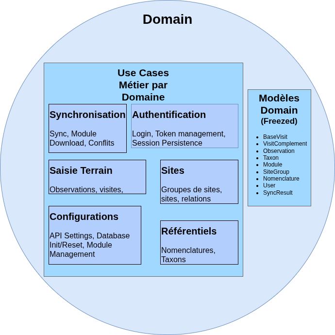 Le Domain ne dépend de RIEN ! C’est le cœur de l’application, complètement indépendant des frameworks et technologies.